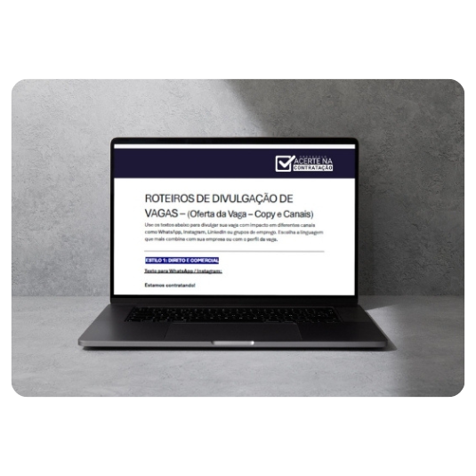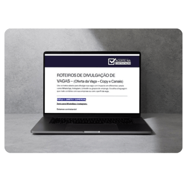 Aqui você vai ter em mãos ferramentas para atrair os melhores candidatos, você vai entender com um passo a passo simples e prático o que fazer em cada fase que vai desde a abertura da vaga, divulgação, entrevista, testes e a contratação.